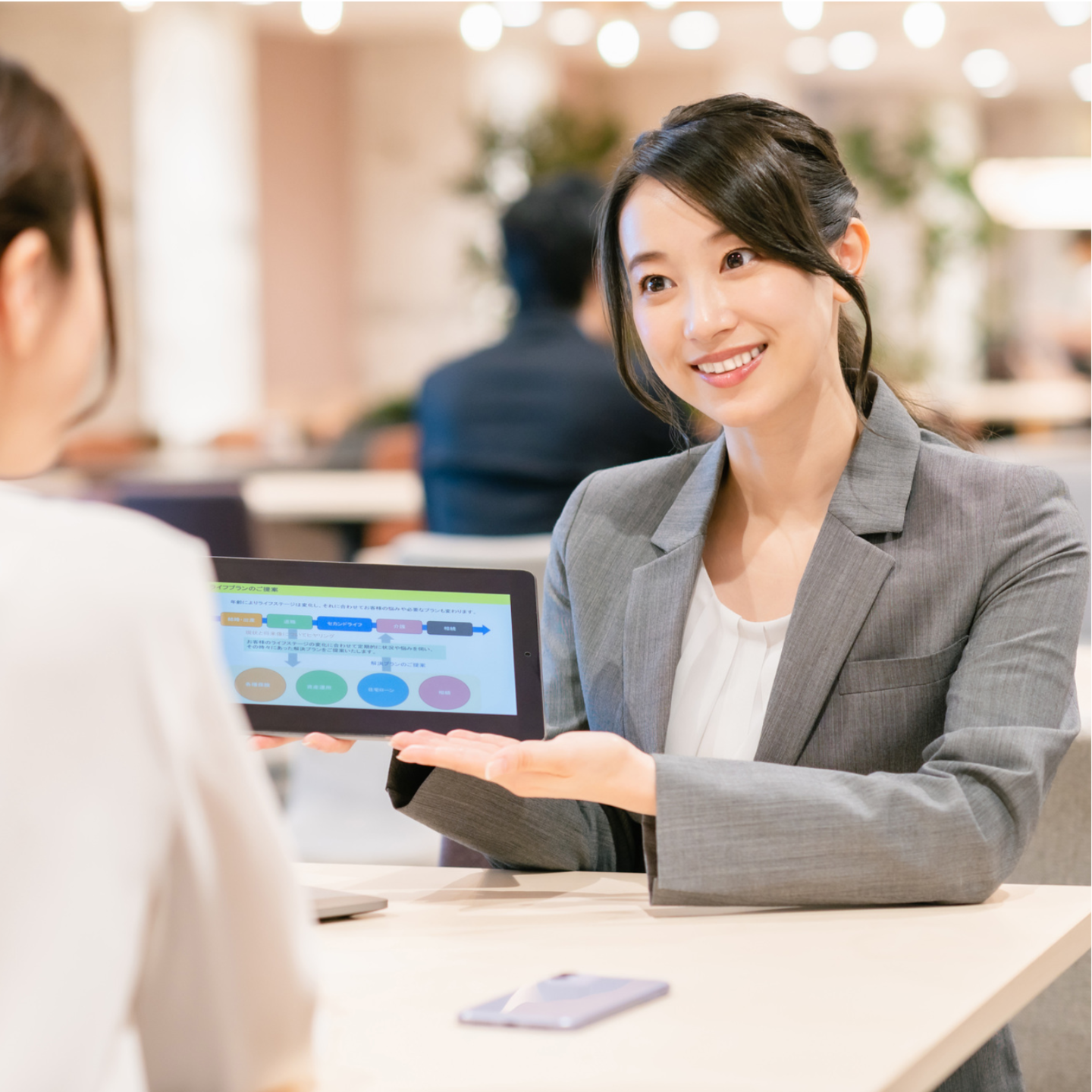 相手の立場になり考え抜き、最適・最新の情報提供とプランニングでお役に立つ。相手の成長と発展に貢献する。